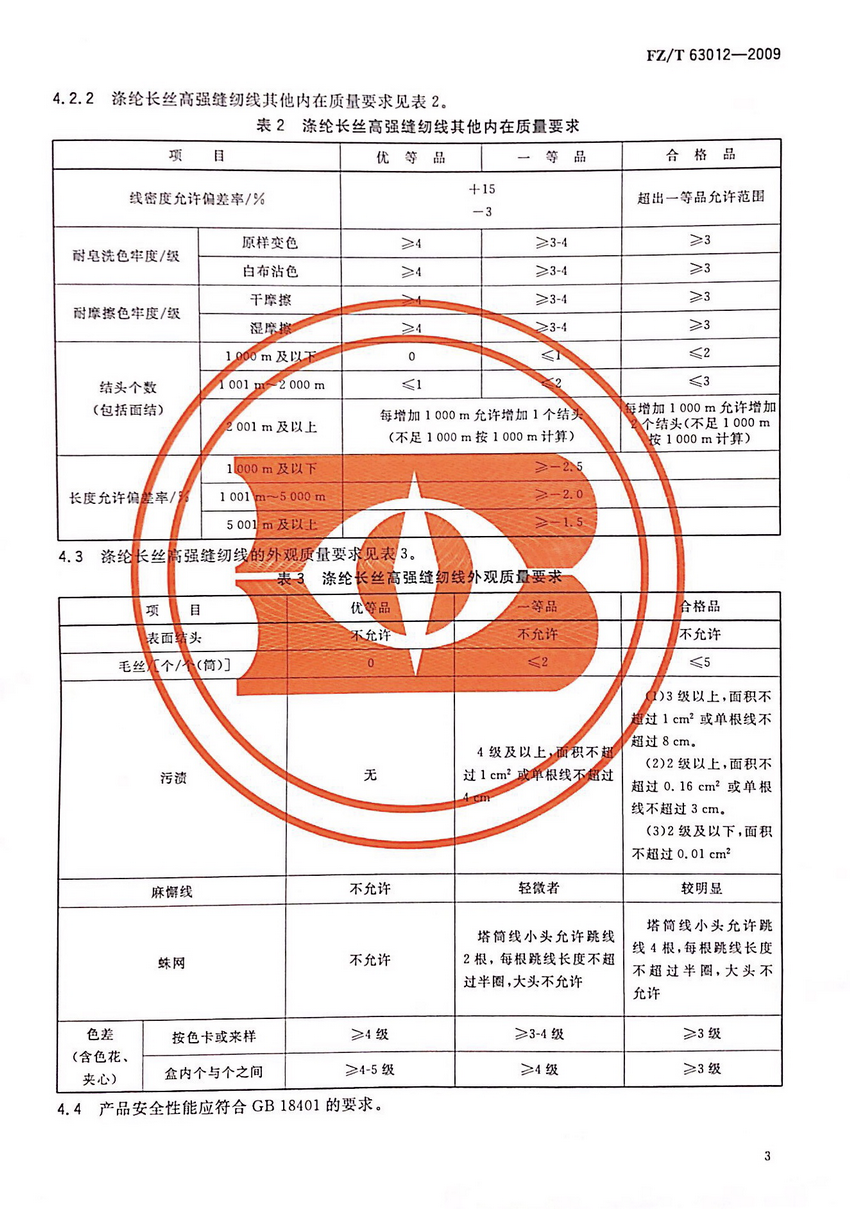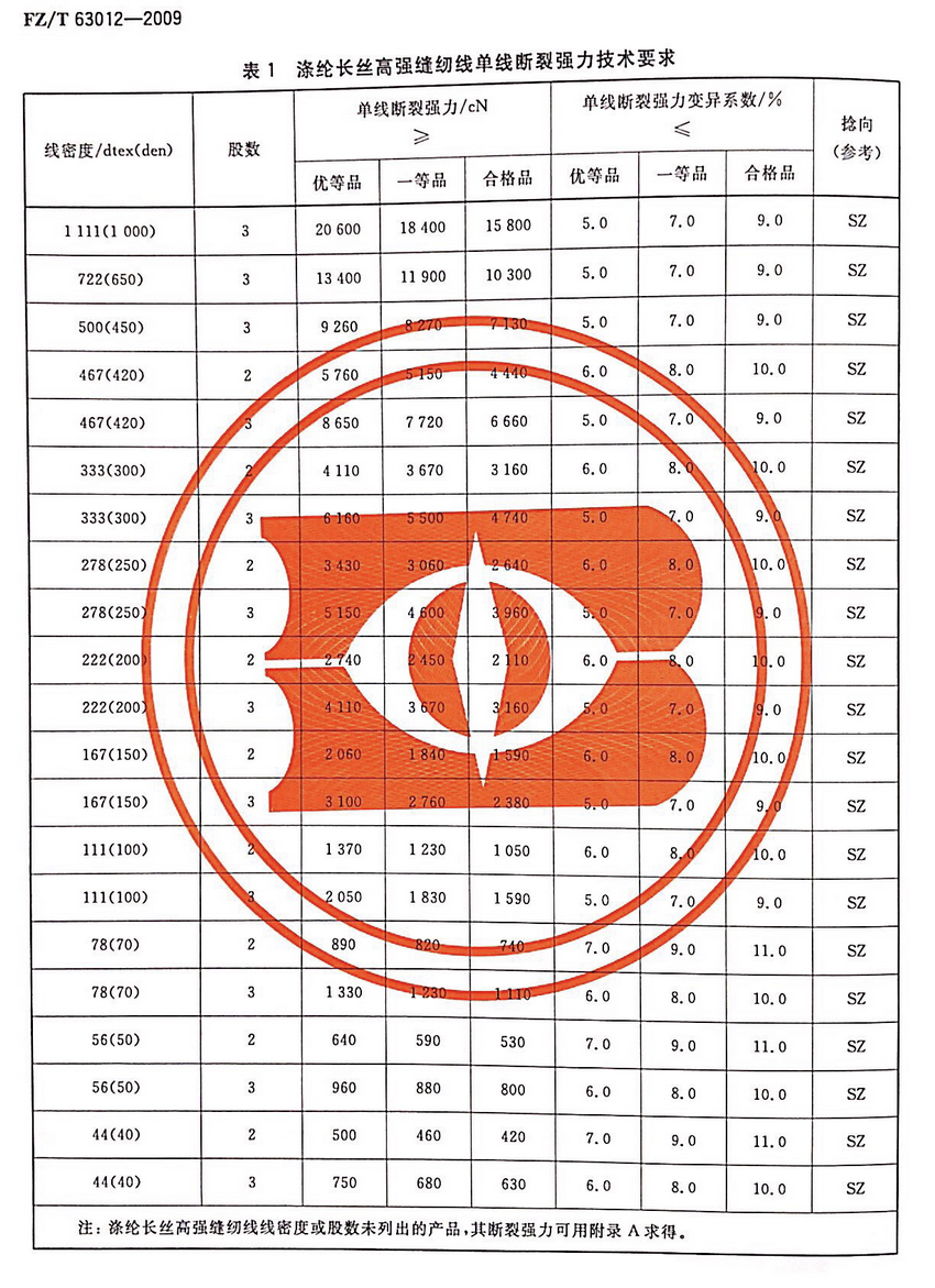 二、滌綸長絲縫紉線的分等規定:滌綸長絲高(gāo)強縫紉線的産品質量分為(wèi)優等品、一等品、合格品。按上(shàng)述表格的等級要求,每批分别取樣3-6個(gè),每批總試驗次數(shù)6-10次。分别對線密度、單線斷裂強力,耐皂洗色牢度、耐摩擦色牢度、長度和(hé)結頭數(shù)進行(xíng)指标數(shù)值比對。并以其中最低(dī)的一項達标來(lái)評定等級。