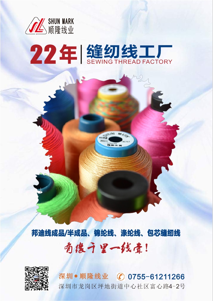 順隆線業主打邦迪線。常規産品有(yǒu):尼龍邦迪線、滌綸邦迪線;錦綸(純尼龍)線、滌綸高(gāo)強線、滌綸短(duǎn)纖維SP線;包芯線、100%純棉線、編織走馬線、蠟線、漁絲線;防火(huǒ)(阻燃)線、防水(shuǐ)線、導電(diàn)縫紉線、抗UV縫紉線,低(dī)彈絲、高(gāo)彈絲...