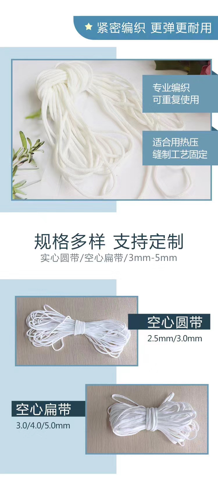 直徑大(dà)小(xiǎo):圓形口罩有(yǒu)2mm,2.5mm,3mm;扁形口罩帶有(yǒu):3mm,4mm,5mm