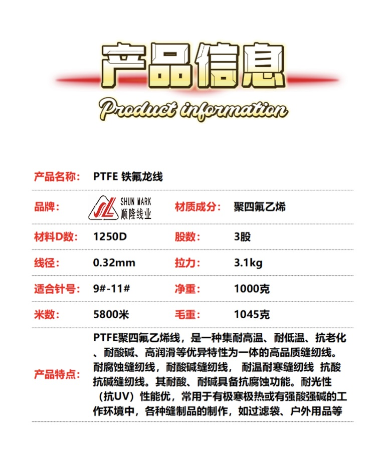 順隆線業PTFE聚四氟乙烯鐵(tiě)氟龍線耐寒耐溫抗腐蝕抗老化縫紉線