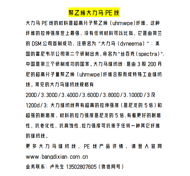 高(gāo)分子聚乙烯大(dà)力馬線150D白色達力馬特種縫紉線