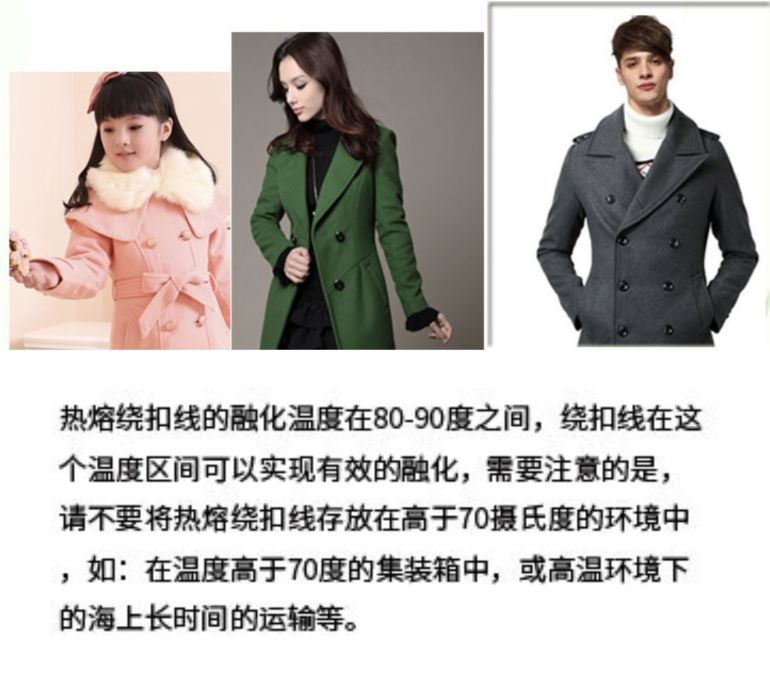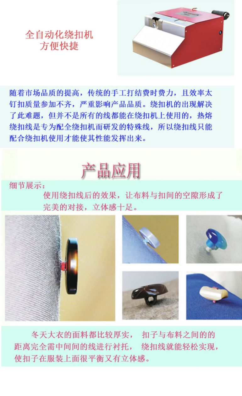 熱熔繞扣線是一種用于衣物繞扣固定的縫紉線,通(tōng)常由氨綸和(hé)錦綸等材料制(zhì)成。通(tōng)過熱熔的方式将紐扣固定在衣物上(shàng),熱熔線需要專用的繞扣機器(qì)配合,機器(qì)繞好以後會(huì)白動加熱使得(de)線融化為(wèi)一個(gè)整體(tǐ),讓布料與紐扣間(jiān)的空(kōng)隙形成了完美的對接,立體(tǐ)感十足。設計(jì)師(shī)看中的是這種繞扣方法所産生(shēng)的整體(tǐ)感,而管埋者看重的是節約了大(dà)量的人(rén)工。避免了傳統釘扣線容易斷線和(hé)扣腳松塌的問題。随着市場(chǎng)品質的提高(gāo),傳統的手工打結費時(shí)費力,且效率太低(dī)扣質量參差不齊,嚴重影(yǐng)響産品品質。全自動繞扣機的出現解訣了此難題,但(dàn)并不是所有(yǒu)的線都能在繞扣機上(shàng)使用的,熱熔繞扣線是專為(wèi)配全繞扣機而研發的特殊線,所以繞扣線隻能配合繞扣機使用才能使其性能發擇出來(lái)。