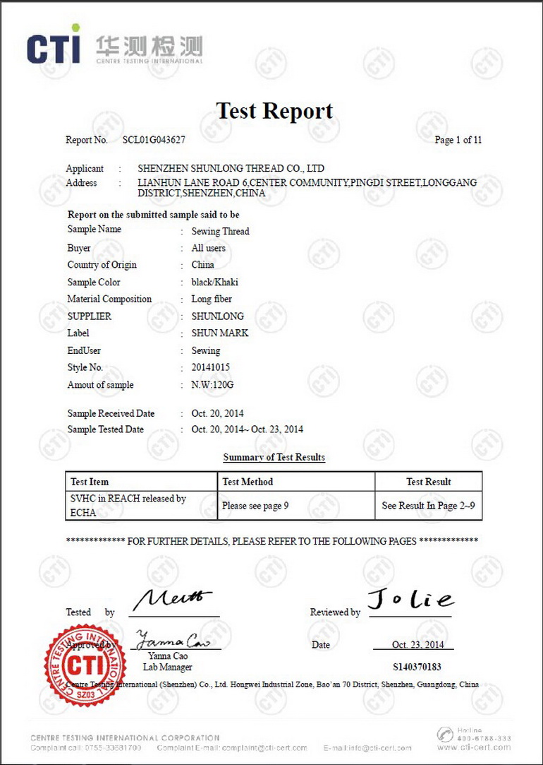 縫紉線最新REACH 155 環保報告(有(yǒu)效期至2015年10月)