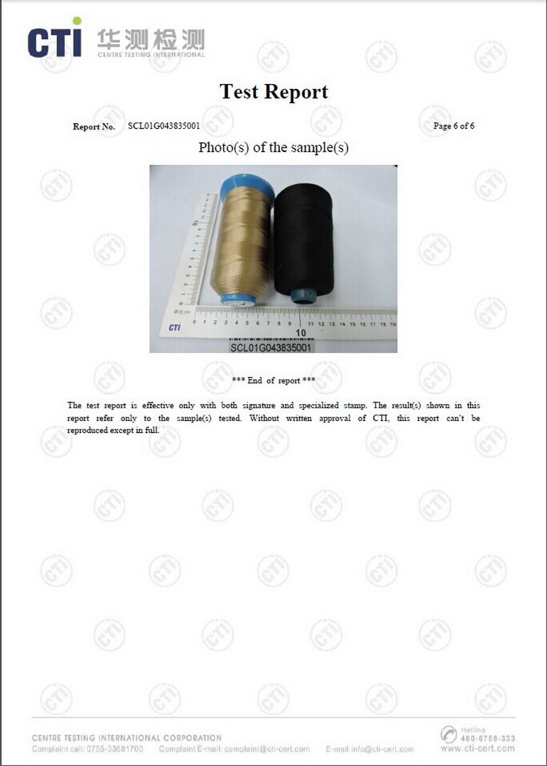 順隆線業邦迪線、高(gāo)強線、滌綸線在2014年5月份通(tōng)過了不含AZO的測試,在8月份通(tōng)過了7P,總镉,總鉛,甲醛的測試;在10月份通(tōng)過了最新REACH 155以及ROSH 10項的測試。并取得(de)了相應的證書(shū)。有(yǒu)需要的客戶可(kě)以聯系順隆線業業務索取需要的環保測試報告。