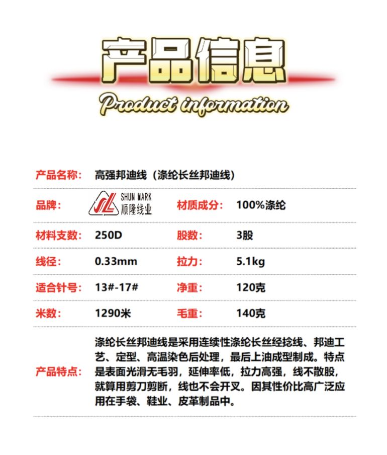 4、更多(duō)滌綸邦迪線 高(gāo)強邦迪線 特多(duō)龍邦迪線 邦迪縫紉線信息,請(qǐng)登入官網:www.bangdixian.com.cn或電(diàn)13502807605盧先生(shēng)查詢