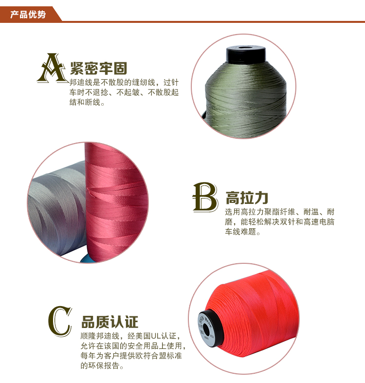 美國邦迪線的優勢:1、邦迪線是不散股的縫紉線,過針車(chē)時(shí)不退撚、不起皺、不散股起結和(hé)斷線;2、選用高(gāo)拉力聚酯纖維、耐溫、耐磨,能輕松解決雙針和(hé)高(gāo)速電(diàn)腦(nǎo)車(chē)線難題。3、順隆邦迪線,經美國UL認證,允許在該國的安全用品上(shàng)使用,每年為(wèi)客戶提供歐符合盟标準的環保報告。