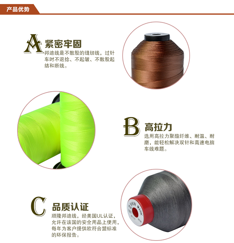 尼龍邦迪線的優勢:1、邦迪線是不散股的縫紉線,過針車(chē)時(shí)不退撚、不起皺、不散股起結和(hé)斷線;2、選用高(gāo)拉力聚酯纖維、耐溫、耐磨,能輕松解決雙針和(hé)高(gāo)速電(diàn)腦(nǎo)車(chē)線難題。3、順隆邦迪線,經美國UL認證,允許在該國的安全用品上(shàng)使用,每年為(wèi)客戶提供歐符合盟标準的環保報告。