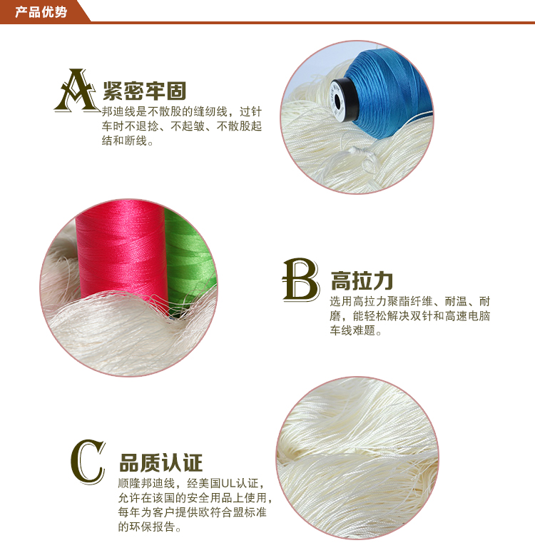 尼龍邦迪線的優勢:1、邦迪線是不散股的縫紉線,過針車(chē)時(shí)不退撚、不起皺、不散股起結和(hé)斷線;2、選用高(gāo)拉力聚酯纖維、耐溫、耐磨,能輕松解決雙針和(hé)高(gāo)速電(diàn)腦(nǎo)車(chē)線難題。3、順隆邦迪線,經美國UL認證,允許在該國的安全用品上(shàng)使用,每年為(wèi)客戶提供歐符合盟标準的環保報告。