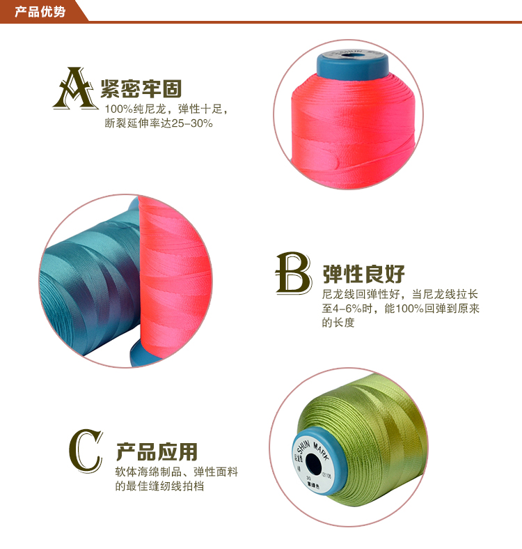 錦綸線的優勢:100%純尼龍,彈性十足,斷裂延伸率達25-30%;尼龍線回彈性好,當尼龍線拉長至4-6%時(shí),能100%回彈到原來(lái)的長度;軟體(tǐ)海綿制(zhì)品、彈性面料的最佳縫紉線拍檔。