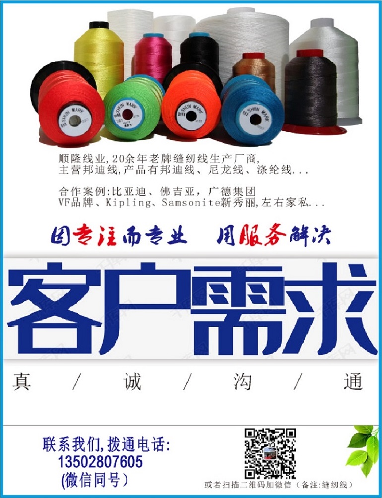【 深圳市順隆線業有限公司】:20多(duō)年專注生(shēng)産邦迪縫紉線自設撚紗染色交貨快品種規格多(duō)可(kě)提供環保報告源頭工廠質量保證質量問題可(kě)退貨足稱足碼價格優惠撚線染色成型配送一條龍服務。公司現擁有(yǒu)标準廠房(fáng)5000多(duō)平方米,員工一百多(duō)人(rén),年生(shēng)産能力1500多(duō)噸。本着“和(hé)諧、創新、勤儉、立質、立信”的企業核心價值觀理(lǐ)念,深圳市順隆線業有限公司立志(zhì)要成為(wèi)廣東制(zhì)線行(xíng)業中的領頭羊之一。目前合作(zuò)的知名企業如:比亞迪汽車(chē)、宏盛皮具、左右家(jiā)具等,合作(zuò)的品牌有(yǒu)NIKE、VF、KIPING、RED APPLE等。經過多(duō)年的産品及技(jì)術(shù)創新,已形成一套嚴格的縫紉線生(shēng)産和(hé)管理(lǐ)流程。已通(tōng)過ISO2000:2008質量管理(lǐ)體(tǐ)系認證!展望未來(lái),公司将加強管理(lǐ)、發揮品質以及服務上(shàng)的優勢,竭力為(wèi)各大(dà)縫紉線使用廠商提供更優質的産品和(hé)服務!