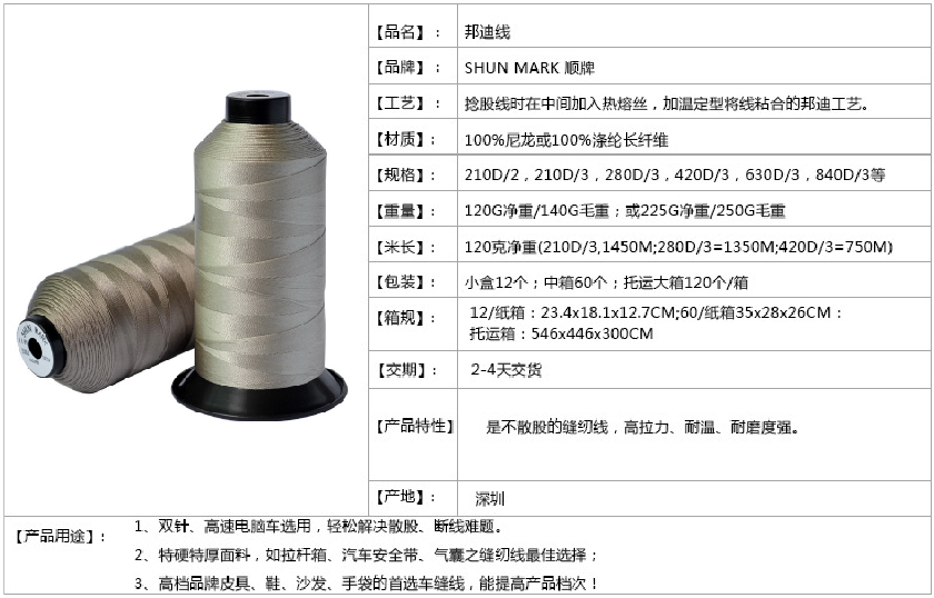 産品描述:不散股縫紉線,邦迪線__縫紉線|邦迪縫紉線|尼龍縫紉線|滌綸縫紉線|深圳順隆線業縫紉線制(zhì)線廠