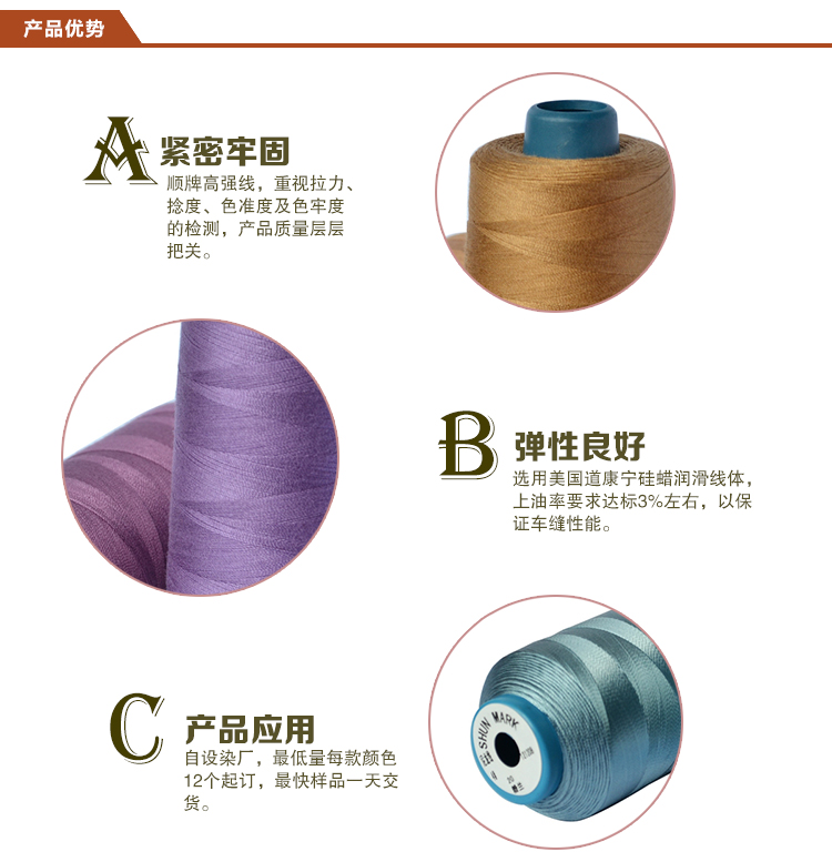 PP線的優勢:順牌SP線,重視(shì)色準度及色牢度等縫紉線指标的檢測,産品質量層層把關;選用美國道(dào)康甯矽蠟潤滑線體(tǐ),上(shàng)油率要求達标3%左右,以保證車(chē)縫性能;自設染廠,最低(dī)量每款顔色12個(gè)起訂,最快樣品一天交貨。
