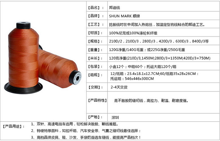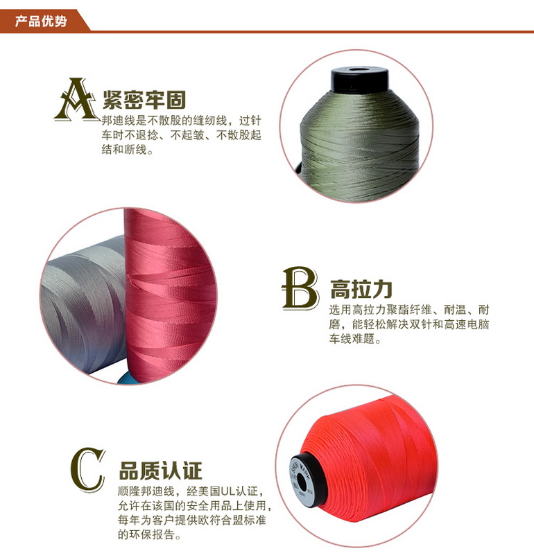 邦迪線的應用:1、雙針、高(gāo)速電(diàn)腦(nǎo)車(chē)選用,輕松解決散股、斷線難題。2、特硬特厚面料,如拉杆箱、汽車(chē)安全帶、氣囊之縫紉線最佳選擇;3、高(gāo)檔品牌皮具、鞋、沙發、手袋的首選車(chē)縫線,能提高(gāo)産品檔次!