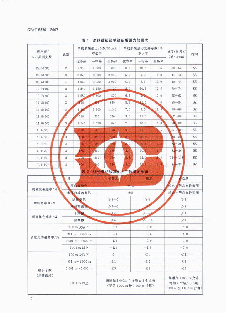 4.2.2 滌綸縫紉線其他內(nèi)在質量的要求見表2。