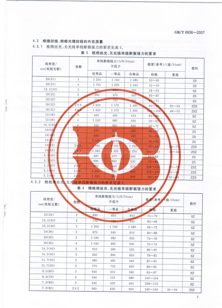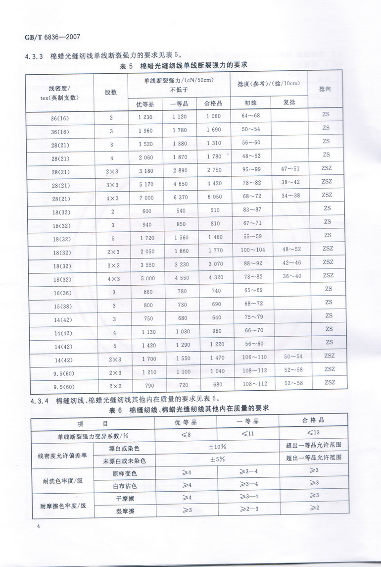 4.1 棉縫紉線、棉蠟光縫紉線、滌綸縫紉線的要求