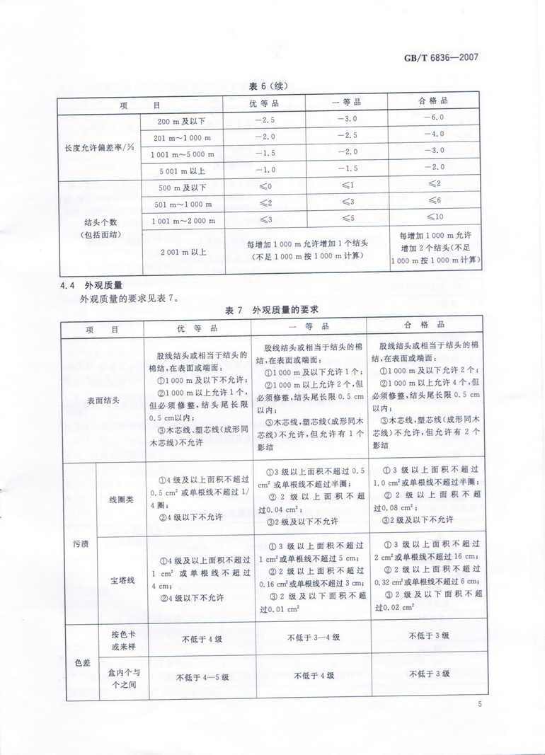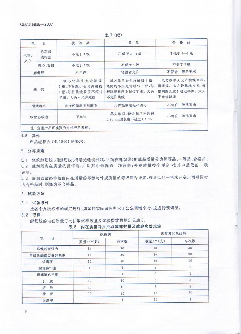 棉縫紉線、棉蠟光縫紉線、滌綸縫紉線的要求分為(wèi)內(nèi)在質量和(hé)外觀質量。內(nèi)在質量包括單線斷裂強力、線密度偏差率、單線斷裂強力變異系數(shù)、耐洗色牢度、耐摩擦色牢度、長度允許偏差率、結頭個(gè)數(shù)等7項。外觀質量包括表面結頭、油污、色差、色花(huā)、夾心等8項瑕疵點。